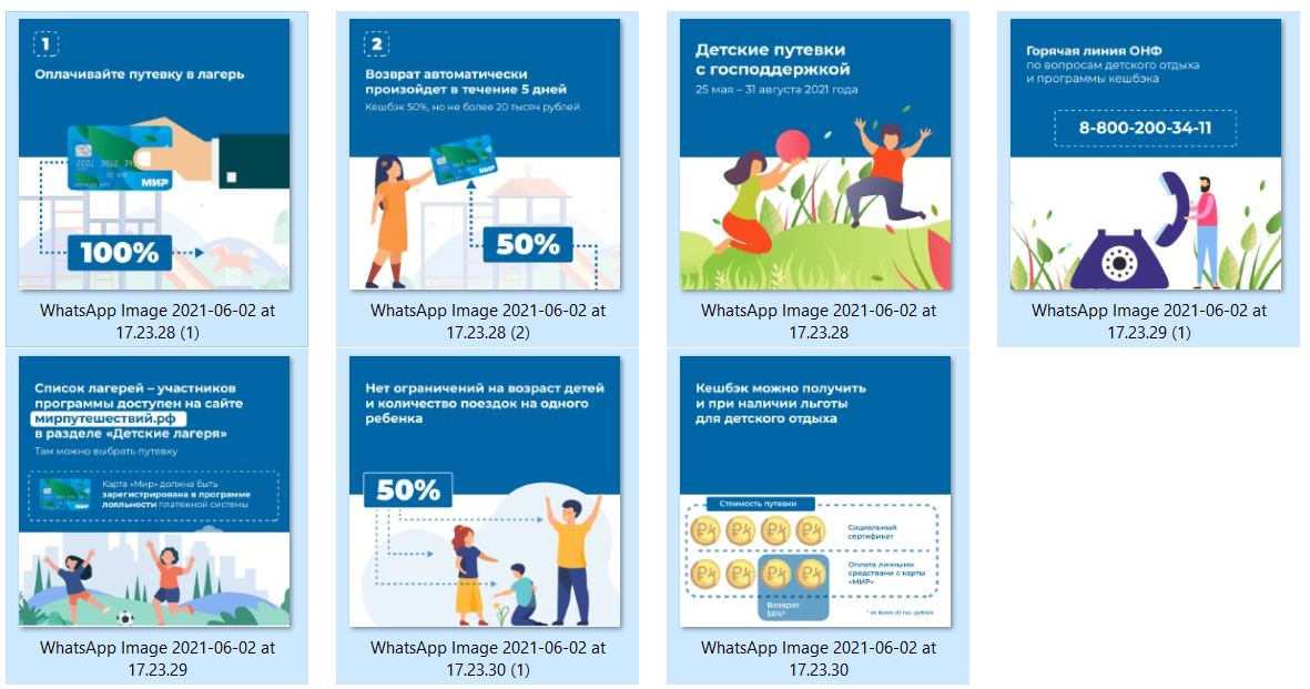 ФЕДЕРАЛЬНАЯ | - Оформить банковскую карту «Мир» (если она в семье отсутствует) - Зарегистрировать карту в программе лояльности на сайте privetmir.ru - Зарегистрироваться на сайте мирпутешествий.рф - Выбрать путевку из предложенного на сайте списка лагерей - Оплатить полную стоимость путевки картой «Мир» - Получить компенсацию на карту в течение 5 дней | 50 % стоимости путевки, но не более 20000 руб. Условия: - период отдыха ребенка должен попадать в срок с 25.05.2021 по 15.09.2021 | Выбрана путевка на сайте мирпутешествий.рф Лагерь расположен в Краснодарском крае. Стоимость путевки - 48000 руб.